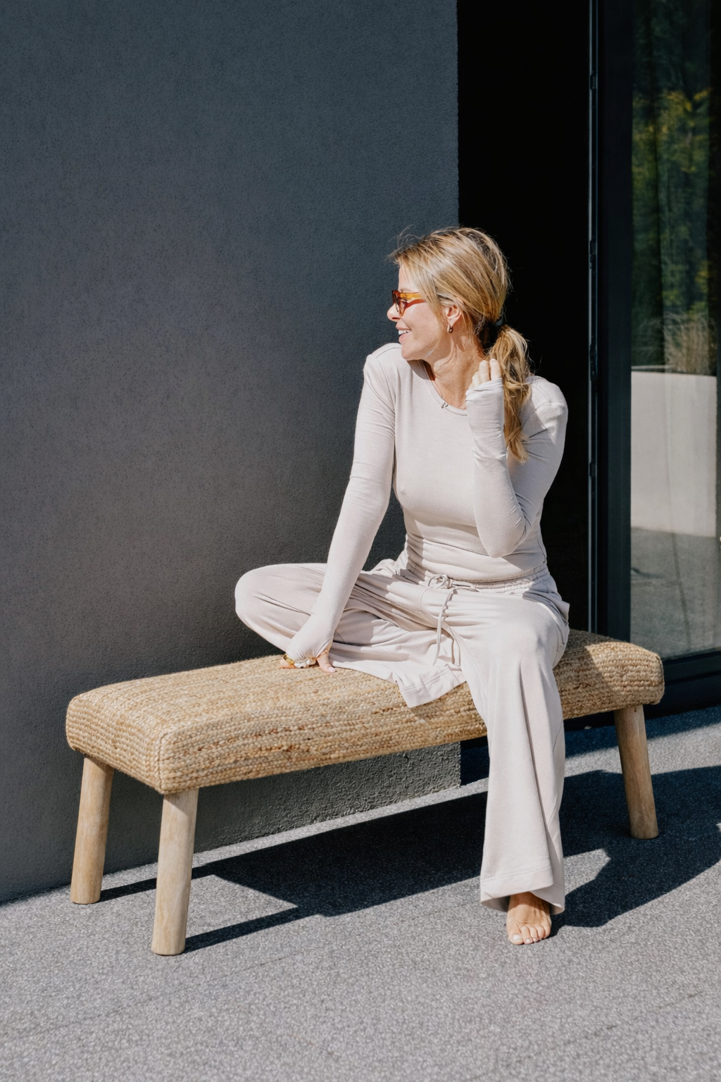 Ustaw ją w przedpokoju jako wygodne miejsce do zakładania butów, w sypialni przy łóżku albo przy toaletce jako lekkie, naturalne siedzisko. Bardzo dobrze wygląda w towarzystwie jasnych tkanin, plecionych dodatków, ceramiki i roślin. To taki mebel, który nie próbuje błyszczeć na siłę, ale i tak od razu robi dobre wrażenie.