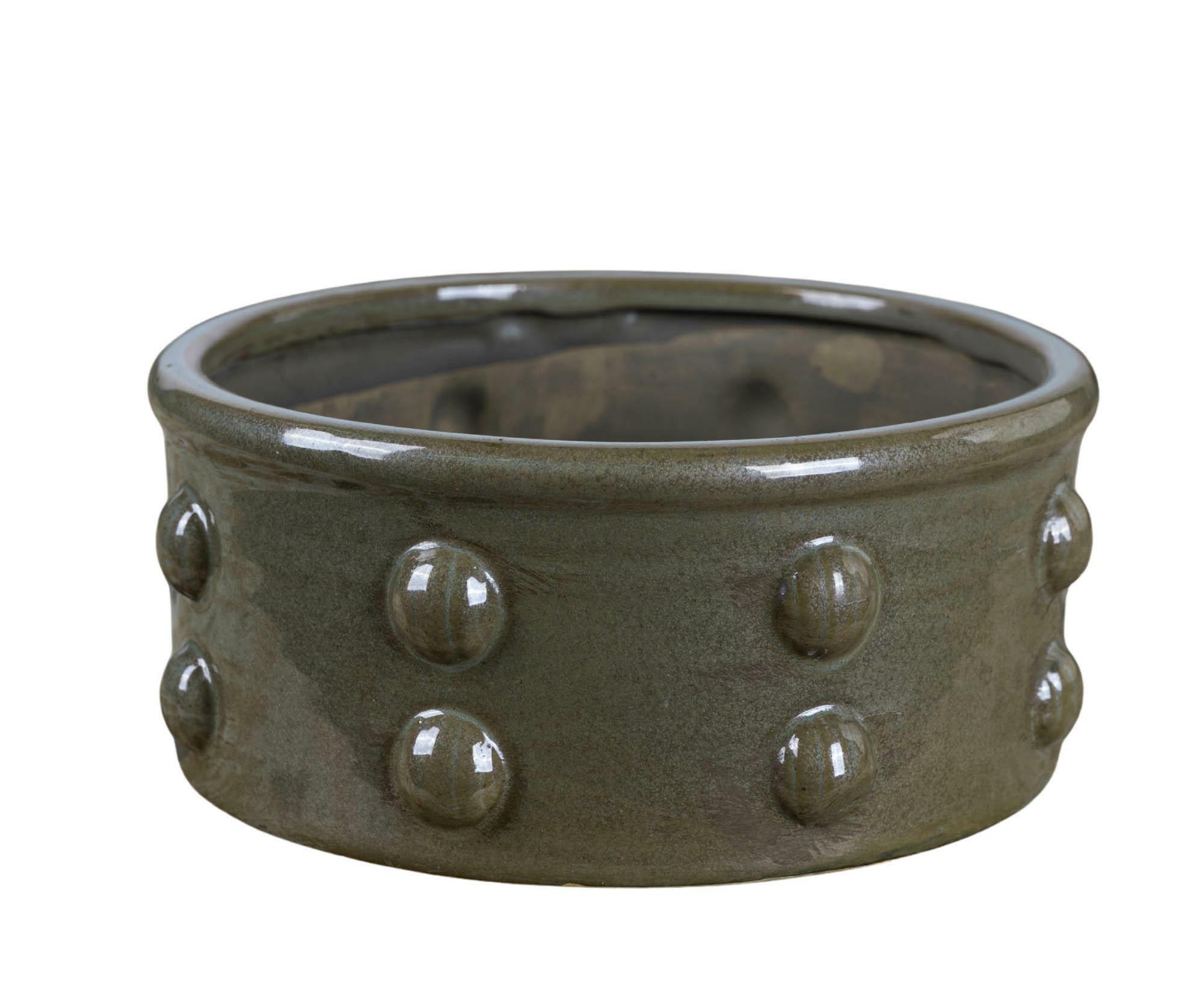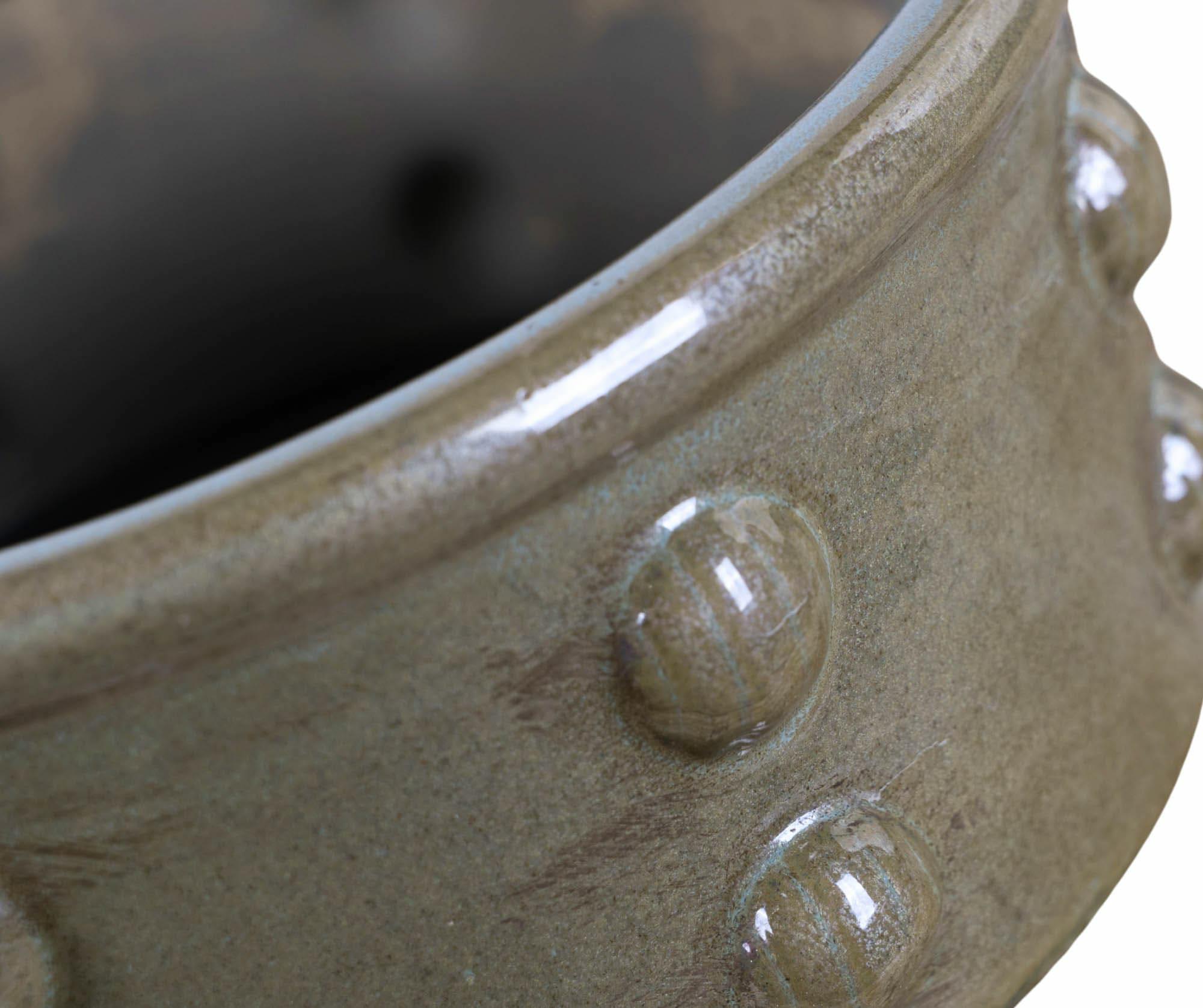 Szeroka i niska osłonka z terakoty to idealne rozwiązanie, jeśli szukasz dekoracji o mocnym charakterze, ale subtelnej formie. Jej oryginalna powierzchnia z wypukłymi zdobieniami oraz szkliwiona tekstura w odcieniach ziemistej zieleni i brązu nadają całości unikalny, ręcznie wykończony wygląd.