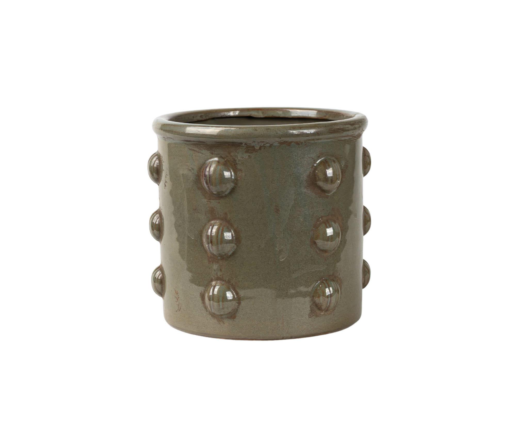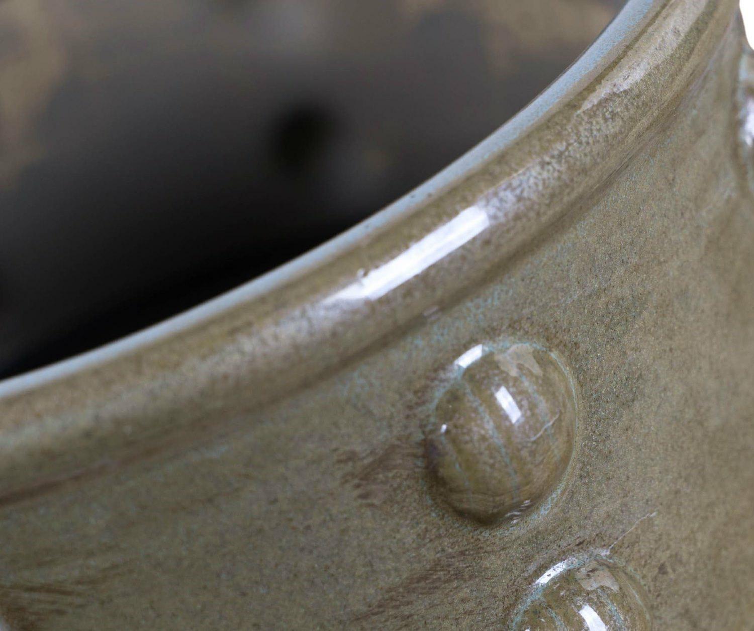 Ta osłonka z terakoty to coś więcej niż tylko miejsce na roślinę. To dekoracyjny akcent, który przyciąga wzrok dzięki oryginalnym, wypukłym detalom na powierzchni. Jej szkliwiona powierzchnia w odcieniach oliwkowej zieleni i brązu pięknie odbija światło, a nieregularny kolor dodaje jej naturalnego, nieco surowego charakteru.