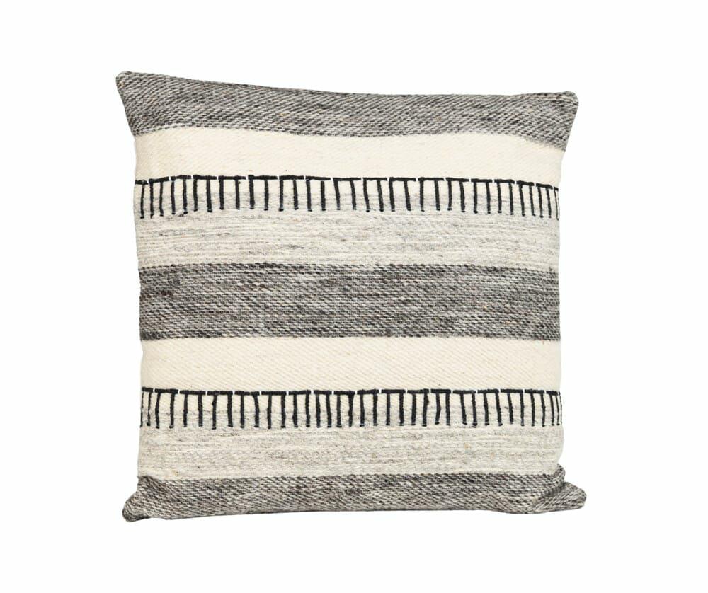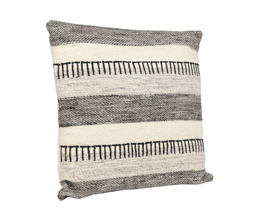Ta poduszka dekoracyjna to propozycja dla osób, które lubią prostotę z charakterem. Stonowany wzór w pasy, utrzymany w odcieniach kremu, szarości i czerni, nadaje wnętrzu spokój i porządek, a jednocześnie wprowadza ciekawą, tekstylną fakturę.