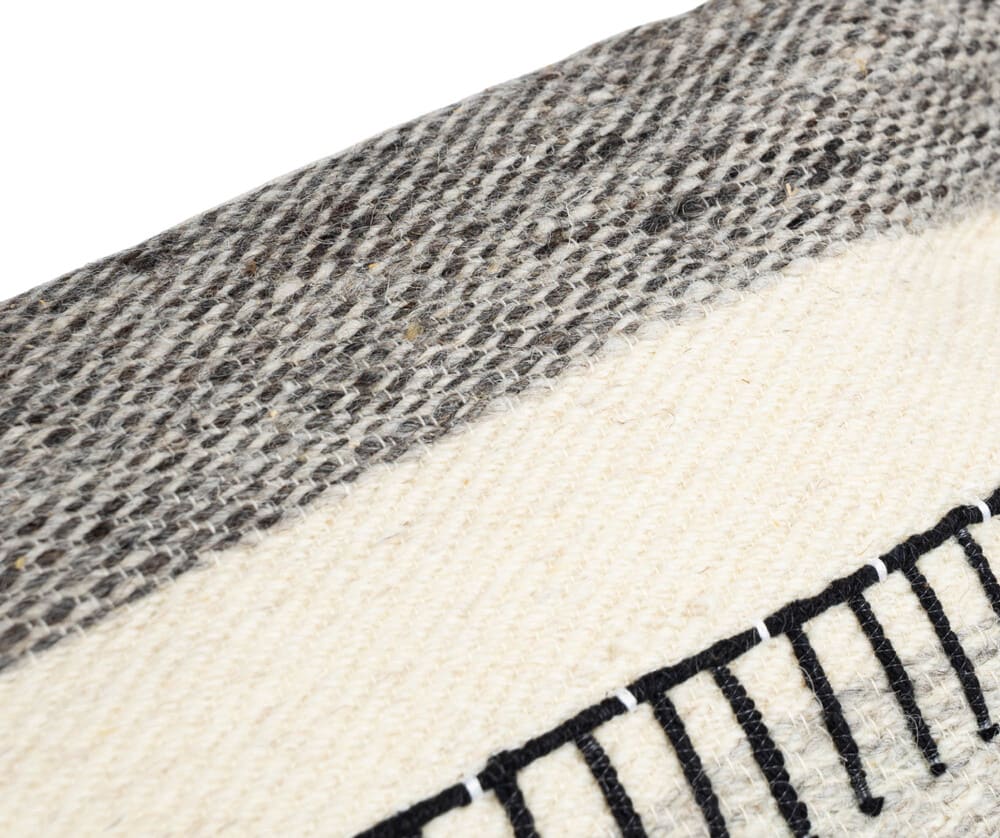 Materiał to mieszanka wełny i bawełny (80% / 20%), dzięki czemu poduszka wygląda naturalnie i przyjemnie się starzeje. Widoczny splot i delikatne nierówności podkreślają jej rękodzielniczy charakter. Poliestrowe wypełnienie zapewnia wygodę – poduszka dobrze trzyma formę, ale pozostaje miękka.