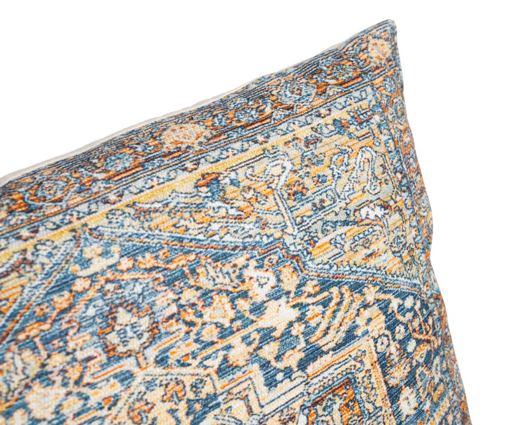 Ta poduszka dekoracyjna wyróżnia się bogatym, orientalnym wzorem inspirowanym klasycznymi dywanami. Połączenie odcieni niebieskiego, beżu i delikatnych, ciepłych akcentów sprawia, że przyciąga wzrok, ale nie dominuje całej aranżacji. To dobry wybór, jeśli chcesz dodać wnętrzu charakteru bez efektu przesytu.