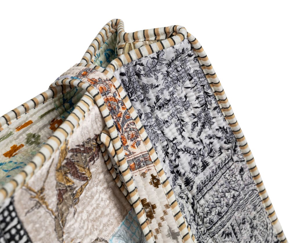Ta bawełniana torba patchworkowa utrzymana jest w spokojnej, rozbielonej palecie kolorów: kremów, złamanej bieli, szarości, beżu i delikatnych akcentów czerni oraz grafitu. Wzór powstał z połączenia wielu drobnych motywów – florystycznych, geometrycznych i ornamentalnych – które razem tworzą wrażenie lekko postarzonej, szlachetnej tkaniny. Całość wygląda bardzo naturalnie, miękko i elegancko, bez nadmiaru kontrastów.