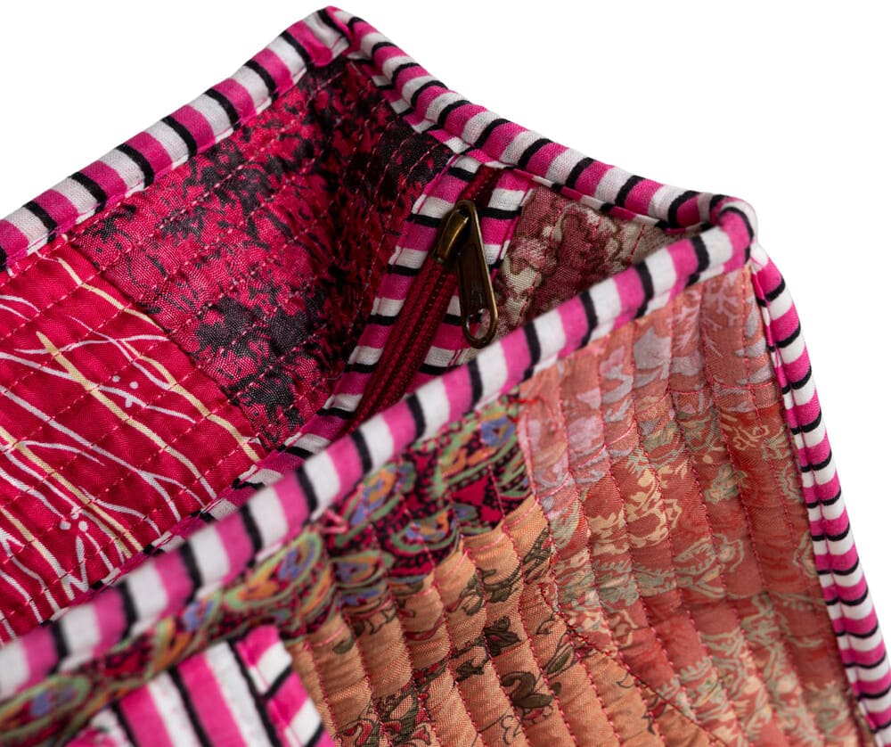 Ta bawełniana torba patchworkowa wyróżnia się ciepłą, nasyconą kolorystyką opartą na odcieniach różu, malin, koralu i przygaszonej czerwieni, przełamanych delikatnymi wzorami roślinnymi i ornamentalnymi. Patchworkowa kompozycja powstała z wielu fragmentów tkanin, dzięki czemu każda torba ma indywidualny charakter i wygląda jak małe, tekstylne dzieło sztuki. Całość jest wyrazista, ale wciąż harmonijna – przyciąga wzrok, nie przytłaczając stylizacji.
