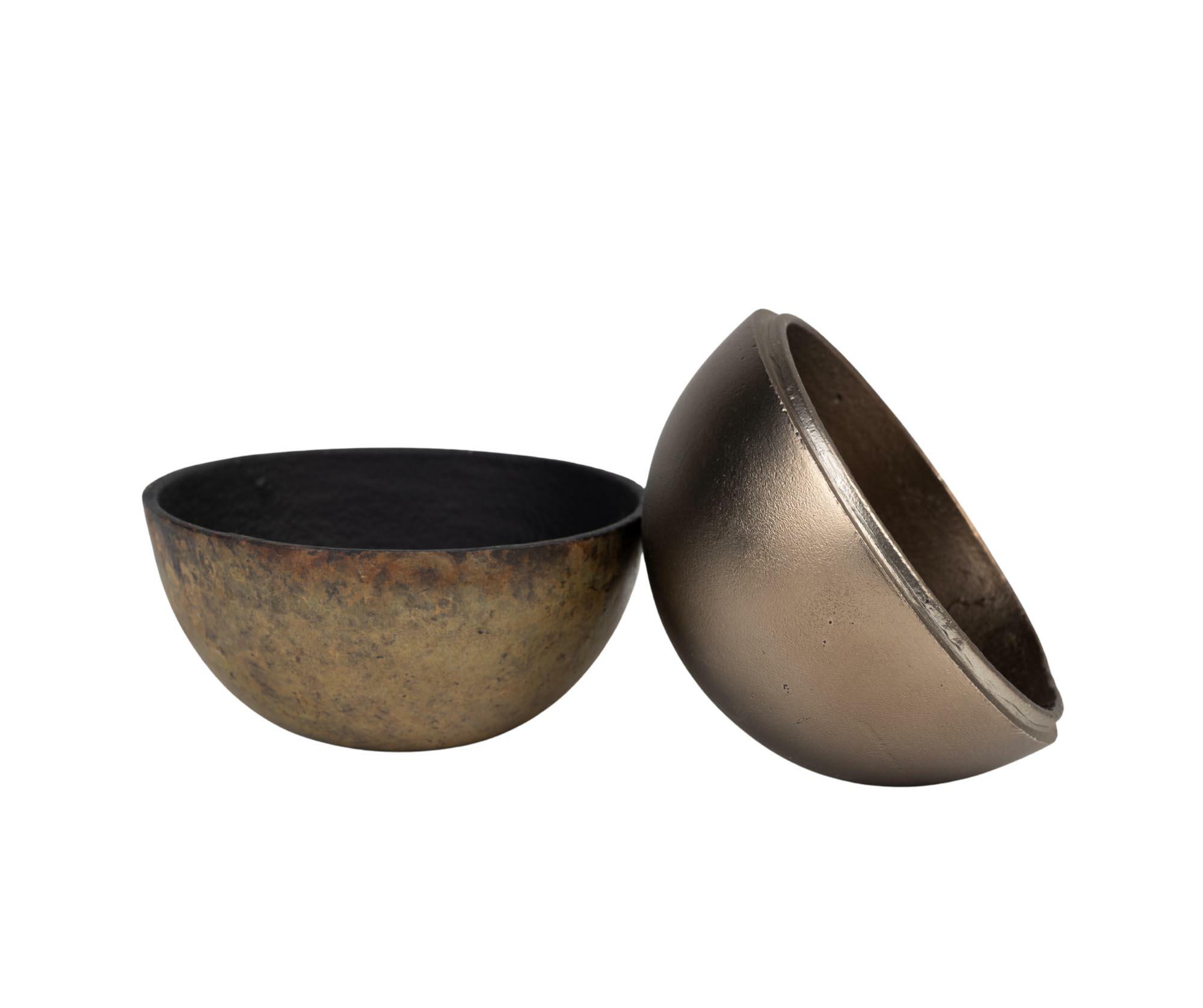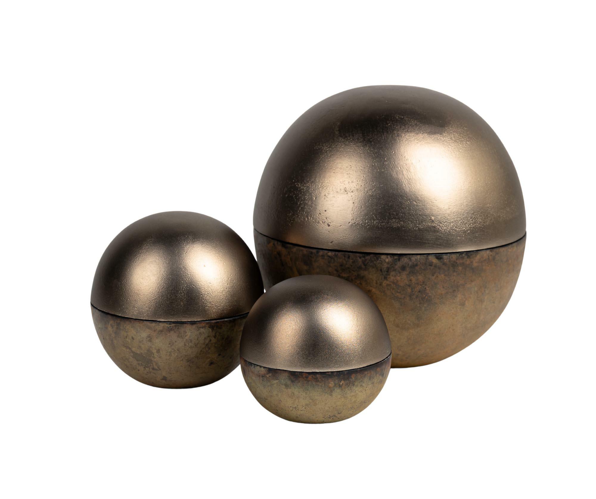 Każda kula składa się z dwóch części, stanowiąc dyskretne miejsce do przechowywania drobiazgów. Górna połowa zachwyca satynowym, brązowo-złotym połyskiem, podczas gdy dolna posiada matową, przetartą teksturę, nadającą przedmiotowi antycznego charakteru. To dekoracja, która doskonale odnajdzie się w luksusowych gabinetach, nowoczesnych salonach czy sypialniach w stylu glamour.