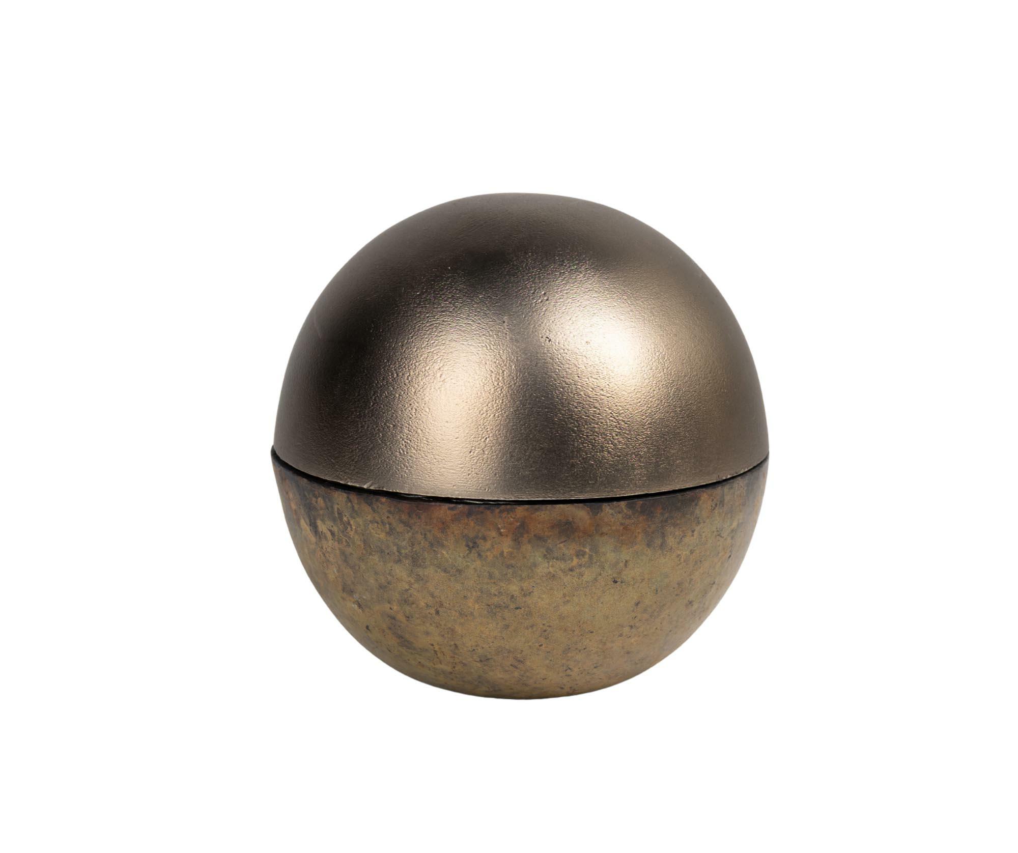 Pudełko Kula to niezwykłe połączenie funkcjonalności i minimalistycznej rzeźby. Wykonane w formie idealnej sfery, przyciąga wzrok unikalnym wykończeniem, które łączy nowoczesny metaliczny blask z surową, postarzaną strukturą.