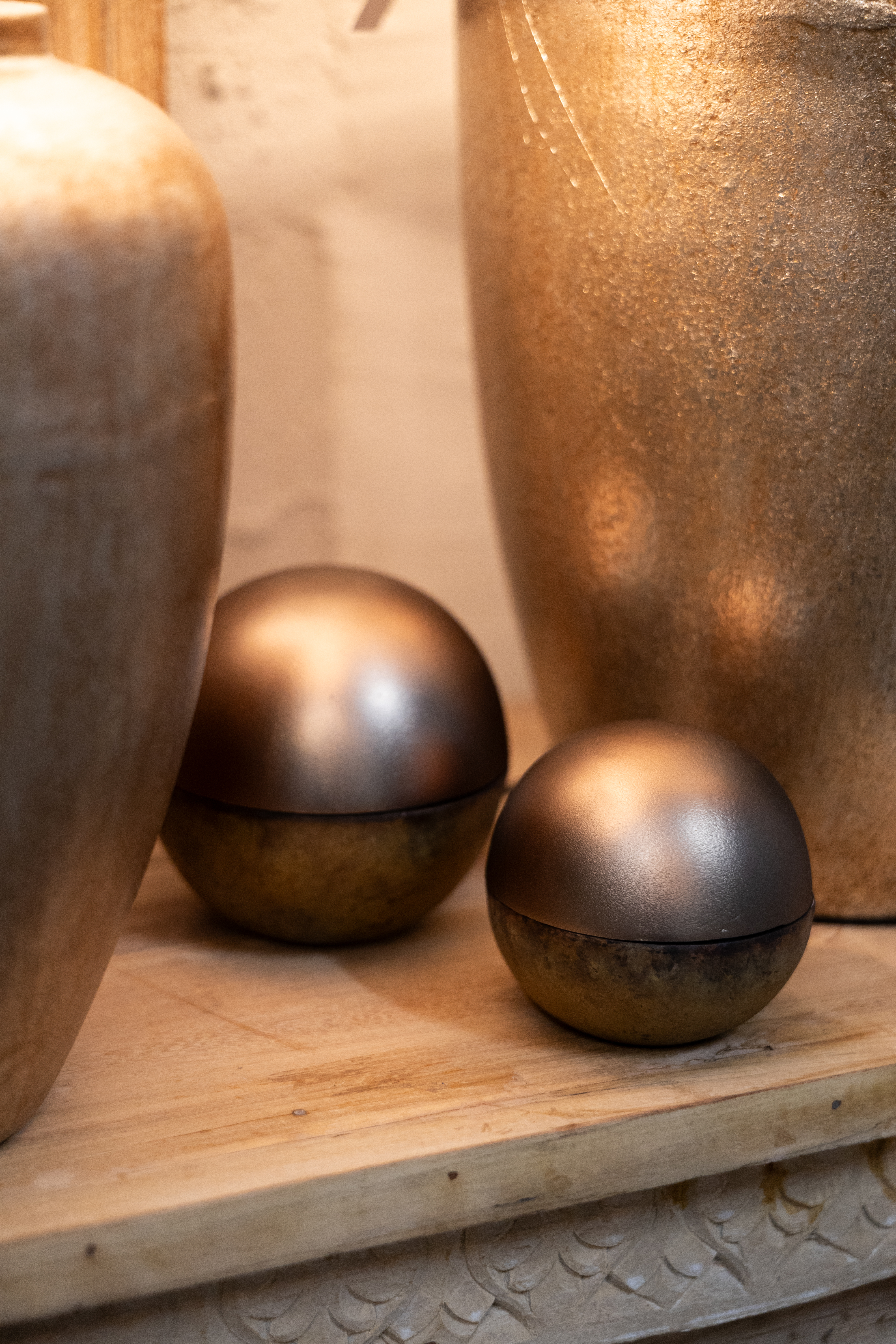 Metalowe pudełko dekoracyjne w kształcie kuli to połączenie prostej formy i wyrazistego wykończenia. Geometryczna bryła nadaje mu charakter nowoczesnego dodatku, który dobrze odnajduje się zarówno w minimalistycznych, jak i bardziej wyszukanych aranżacjach wnętrz.