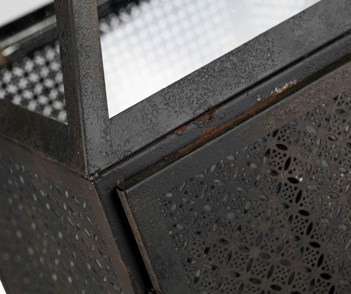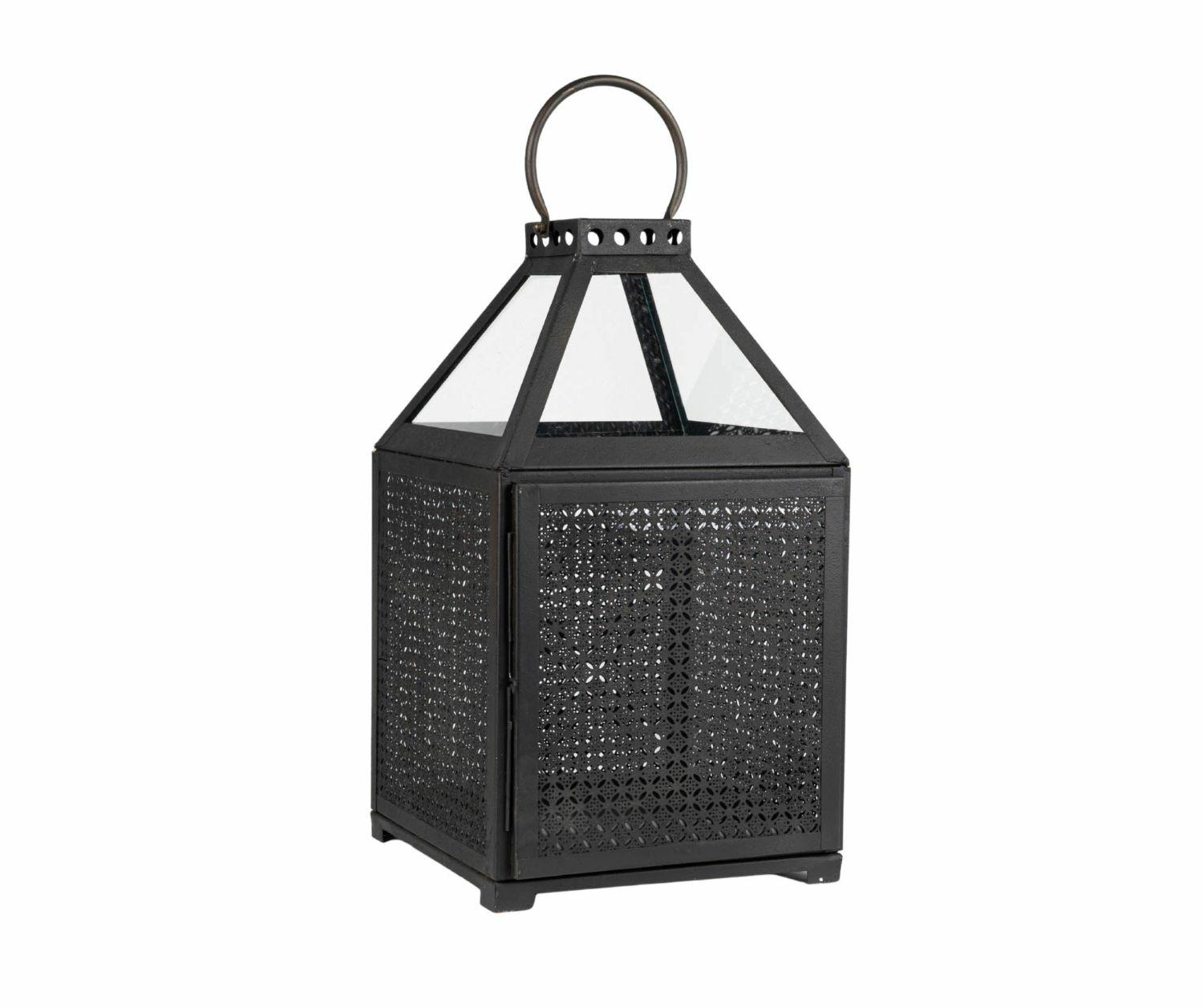 Ta metalowa latarnia dekoracyjna w kolorze głębokiej czerni łączy orientalny charakter z nowoczesną formą. Jej ścianki zdobi misterny, ażurowy wzór, który po zapaleniu świecy tworzy na ścianach magiczne refleksy świetlne. Przeszklone górne panele dodają elegancji i dbają o rozproszenie światła.