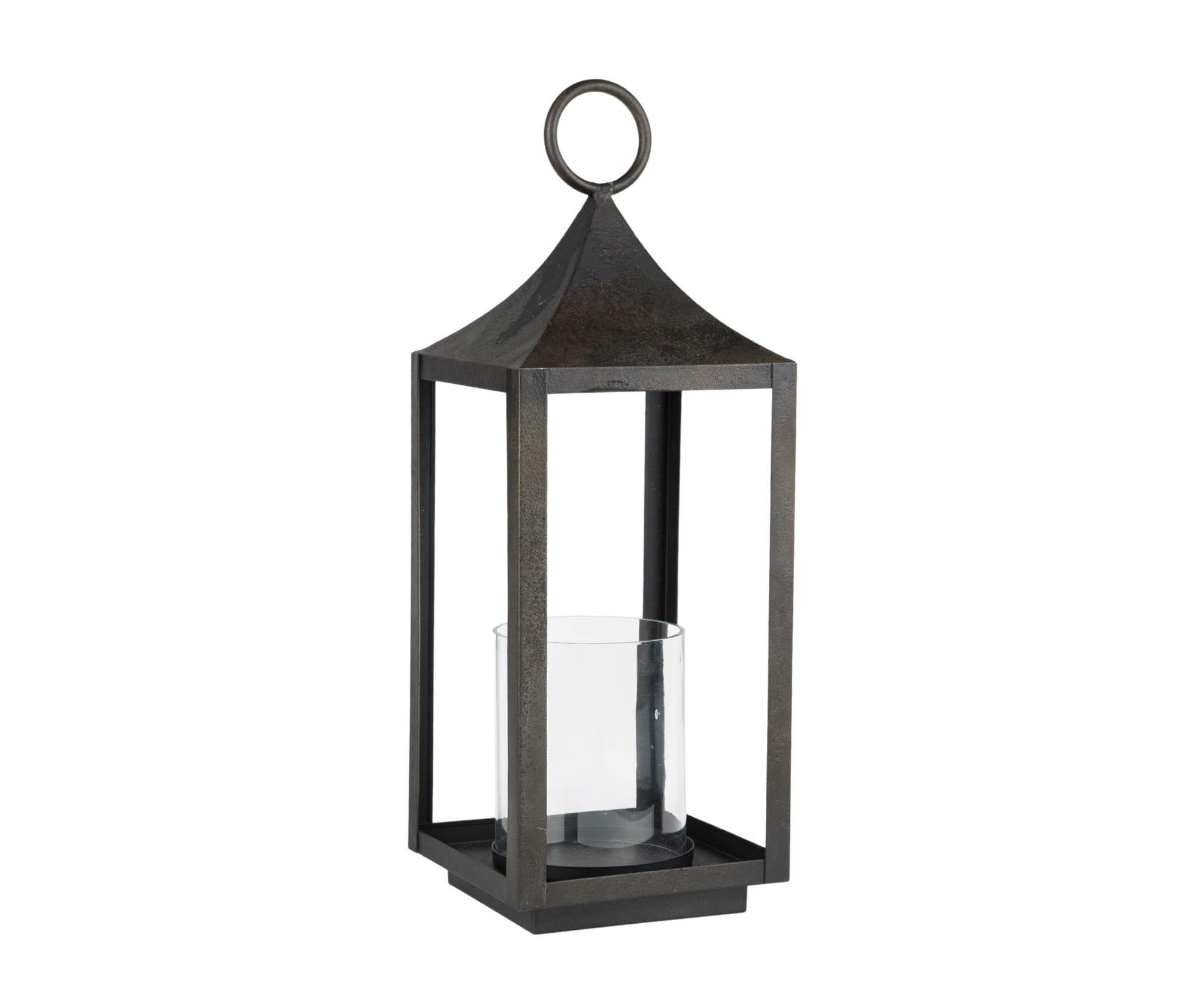 Ta wysoka metalowa latarnia w odcieniu przyciemnionej czerni to idealne połączenie prostoty i elegancji. Jej geometryczna forma, subtelnie zaokrąglony daszek i ozdobny uchwyt nadają całości szlachetnego charakteru. Wewnątrz znajduje się szklany wkład na świecę, który zapewnia bezpieczeństwo i estetykę podczas użytkowania.