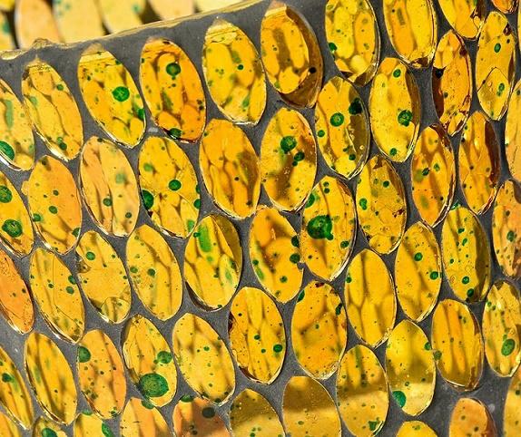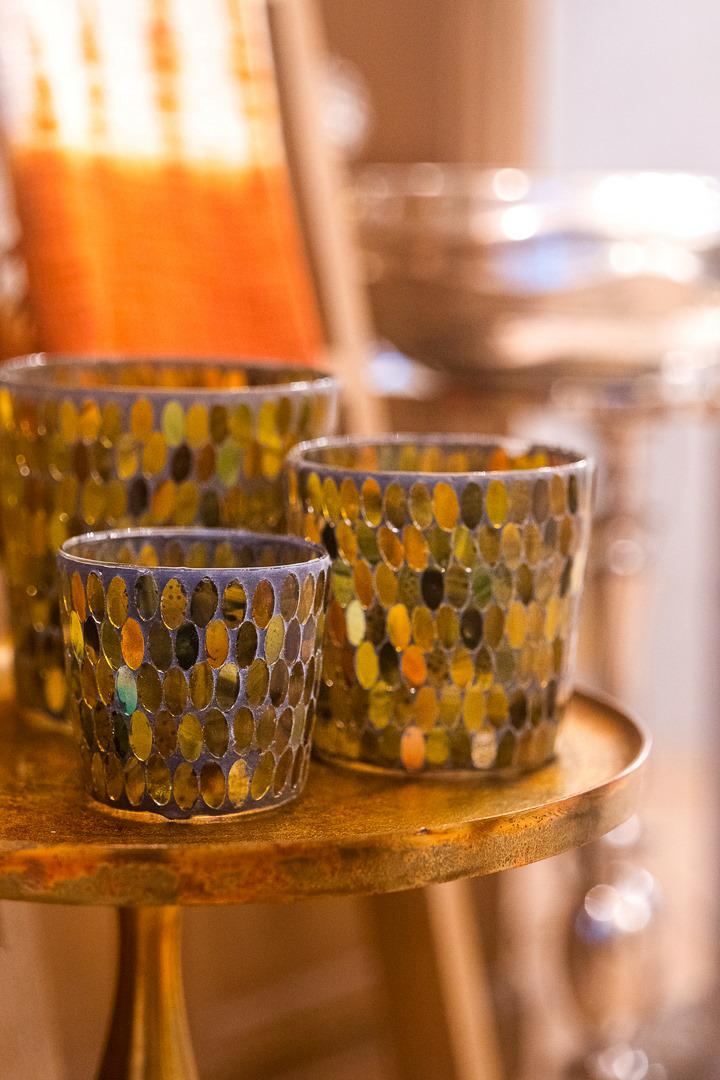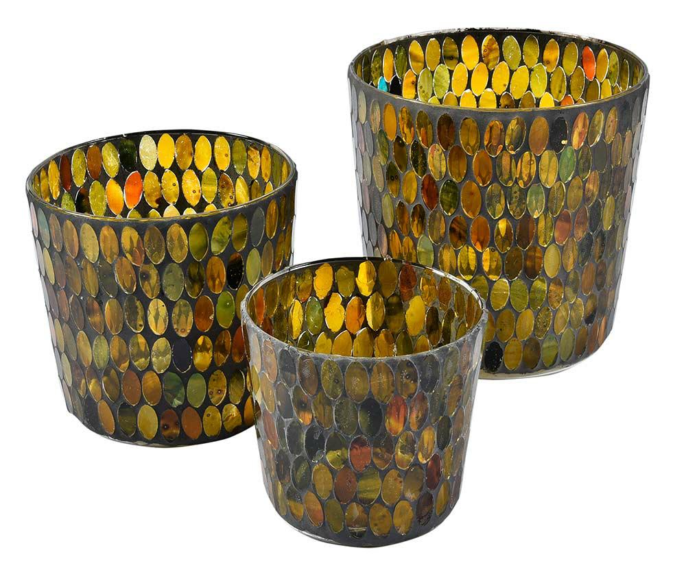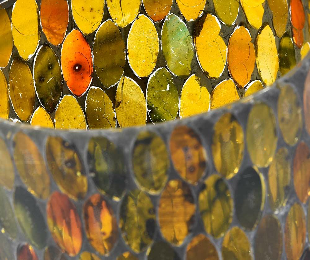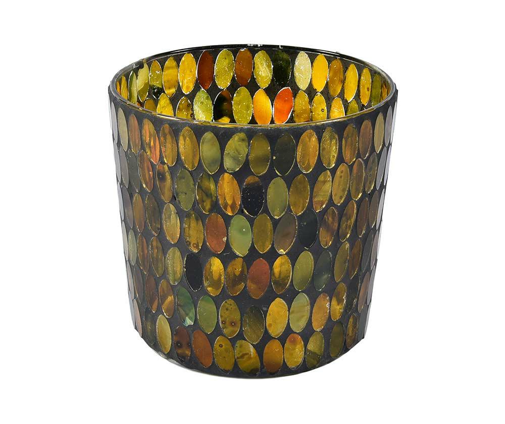 Mały, szklany lampion na świecę typu t-light. Idealny by ozdobić pusty blat komody czy wypełnić miejsce na regale. Światło odbijające się w mozaikowym szkle podkreśla bursztynowo zielony kolor. Zapalone w lampionie świeczki podkreślą wyjątkowy, wieczorowy nastrój. Dekoracja sama w sobie jest niebanalnym elementem aranżacyjnym, może być świecznikiem a także pełnić rolę wazonika na niewielkie kwiaty. Kilka zestawionych z sobą z pewnością przykuje wzrok. Lampion występuje w trzech rozmiarach. Przedstawiony tu to średni.